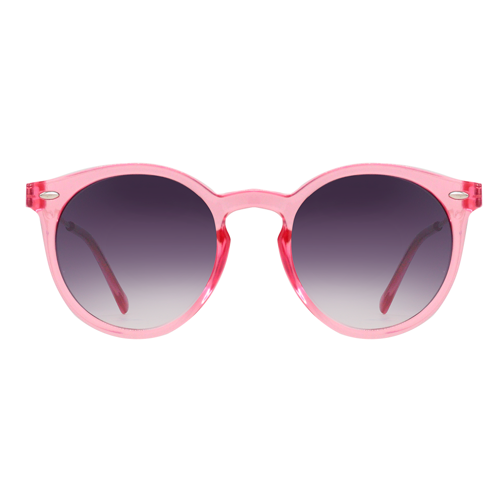 O Óculos de Sol infantil Lentes de sereia rosa possui formato redondo com armação em acetato italiano com acabamento cristal na cor rosa e hastes de metal anticorrosivo. Lentes degrade na cor preta.