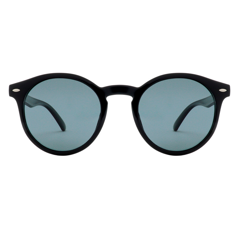 O Óculos de Sol infantil Mini Cool tem formato redondo, armação flexível de silicone preto e hastes com amortecedores internos. Lentes pretas.