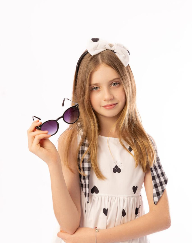 O Óculos de Sol infantil Olhar aventureiro Degradê possui formato redondo com armação em acetato italiano na cor preta e hastes de metal anticorrosivo. Lentes degrade na cor preta.