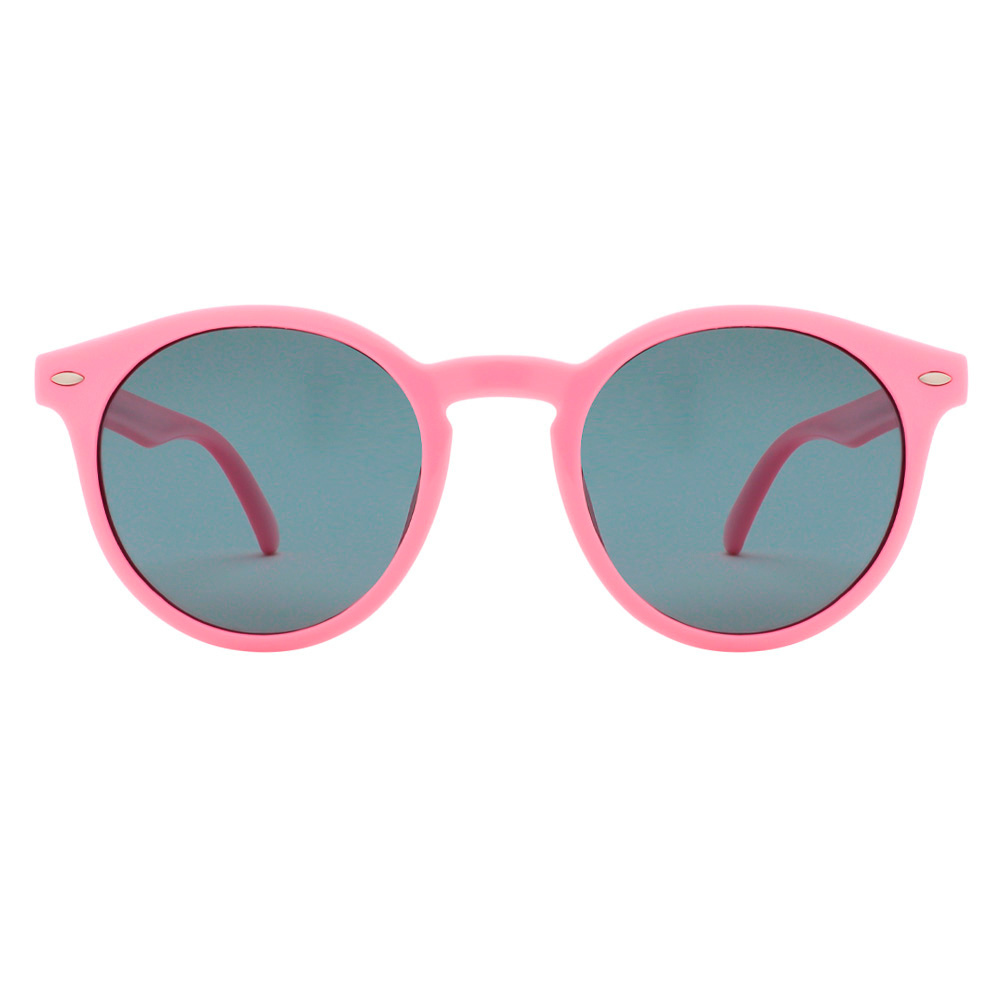 O Óculos de Sol infatil Sorriso cor de rosa tem formato redondo, armação flexível de silicone rosa e hastes com amortecedores internos. Lentes pretas.