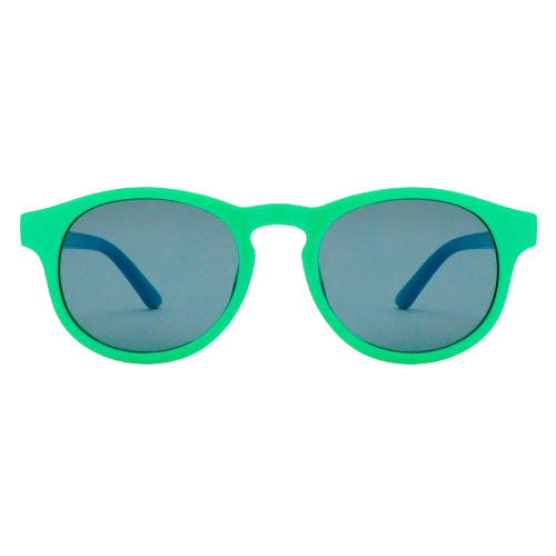 O Óculos infantil de Sol Verde e Azul tem formato redondo, armação flexível de silicone verde e hastes com amortecedores internos na cor azul. Lentes pretas.